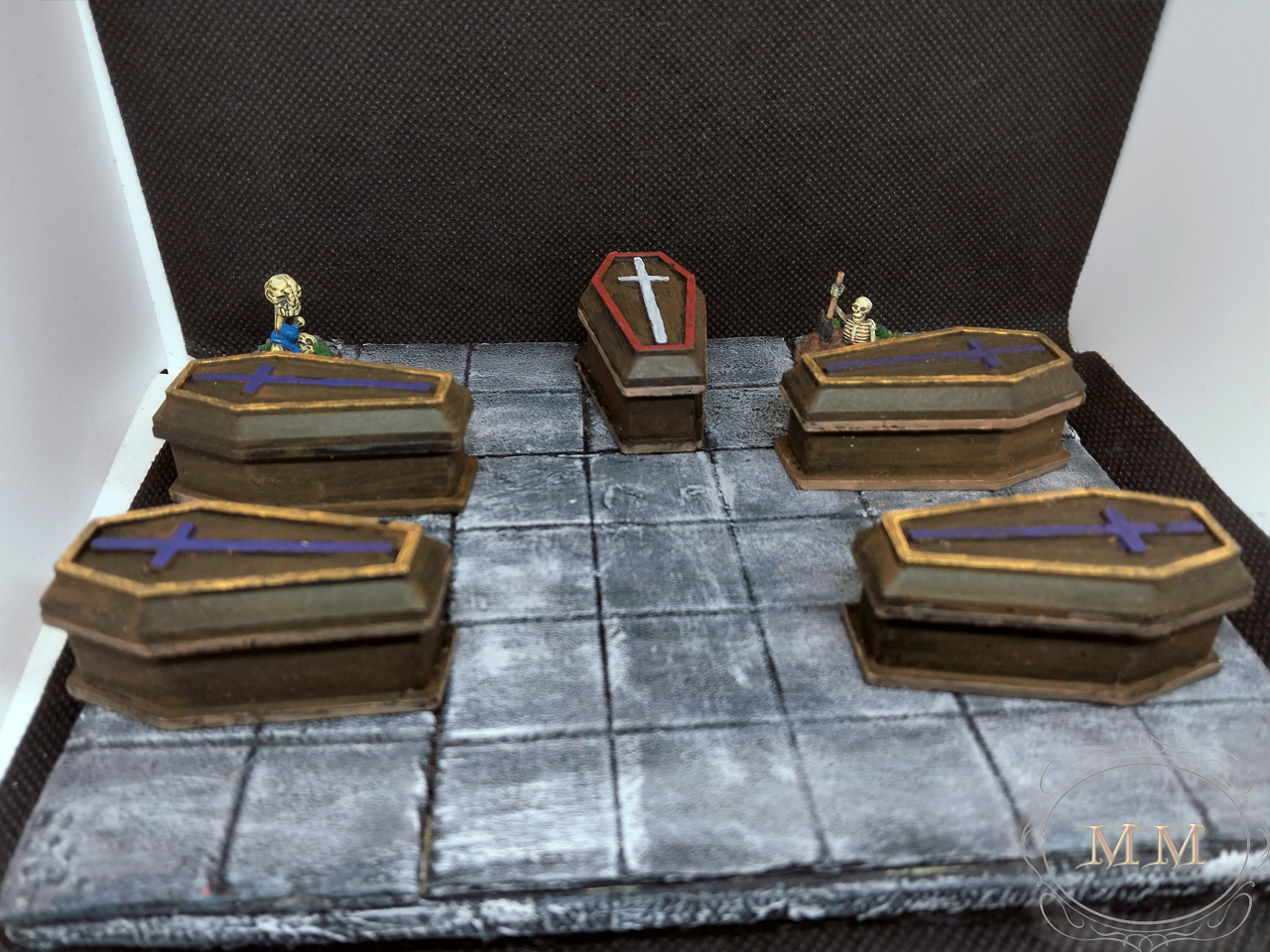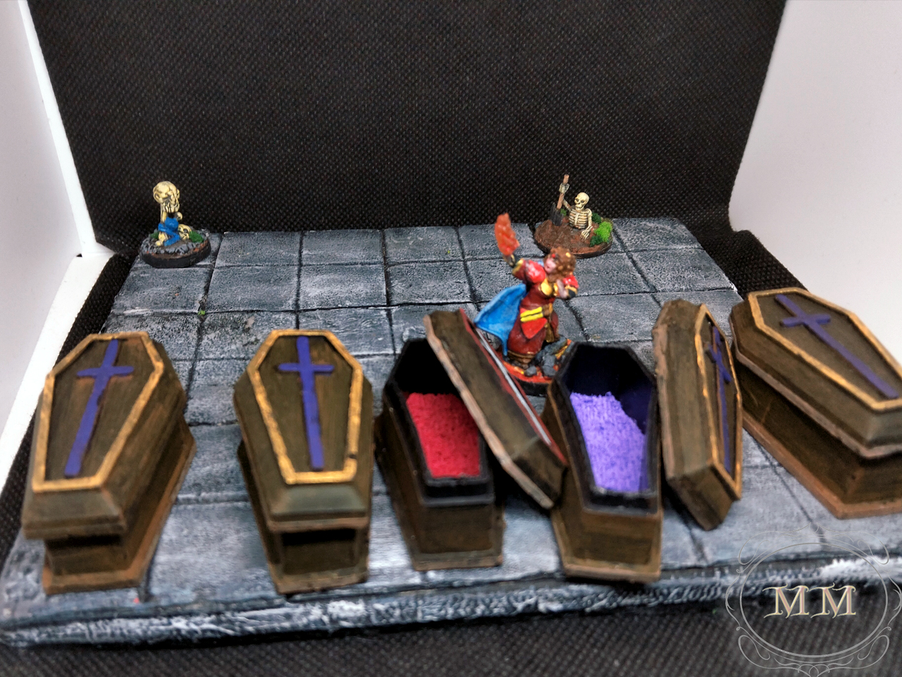 Kupiłem te trumny w chińskim sklepie online na literę „T”, ponieważ okazało się, że do Dungeons & Dragons nadają się praktycznie idealnie. Wypełnienie środka wykonałem z pianki modelarskiej, którą odpowiednio przyciąłem i przykleiłem. W kwestii technicznej oraz doboru spójnej kolorystyki doradzała mi postać z aplikacji „Talkie”, za co jestem bardzo wdzięczny.